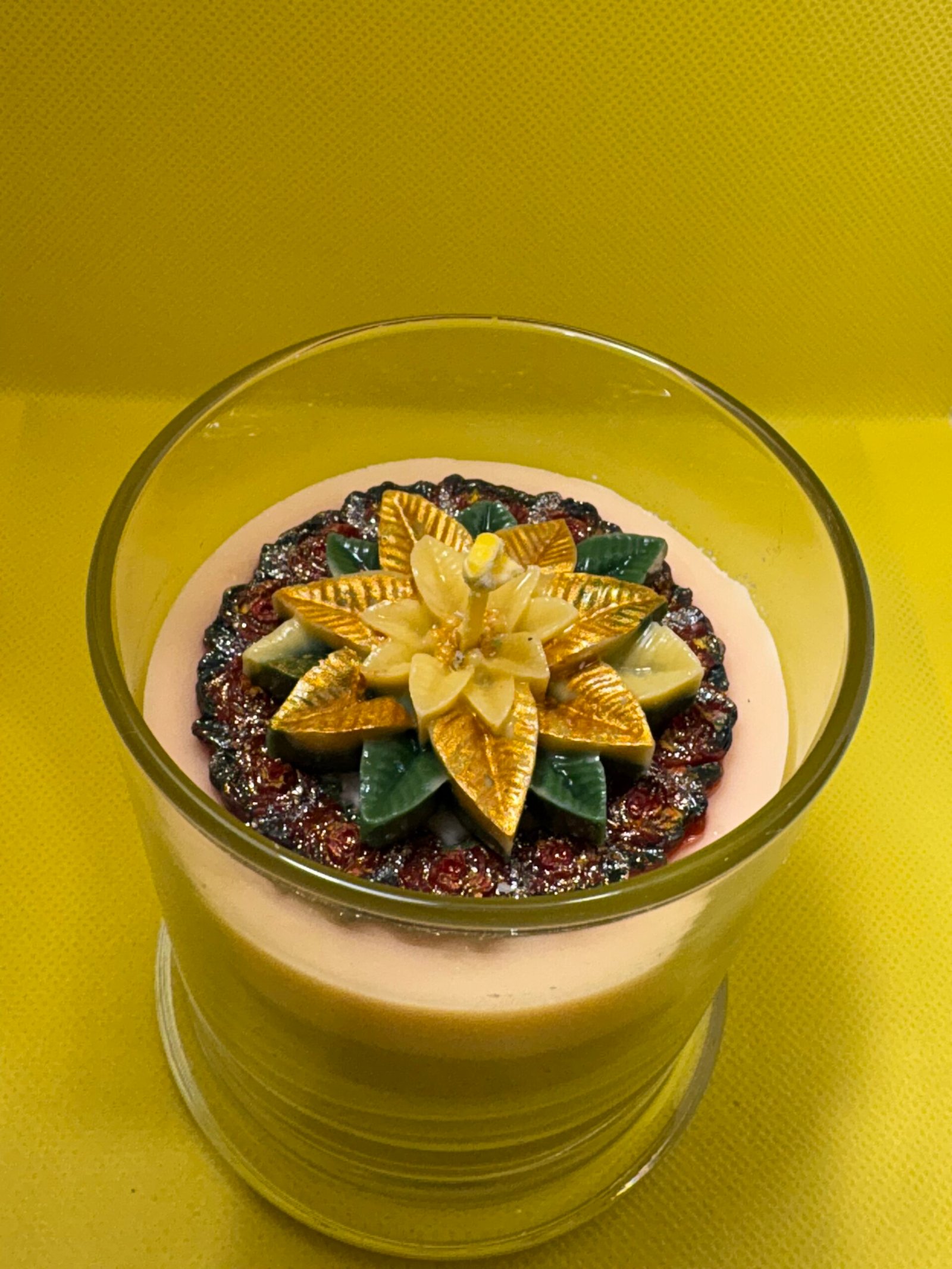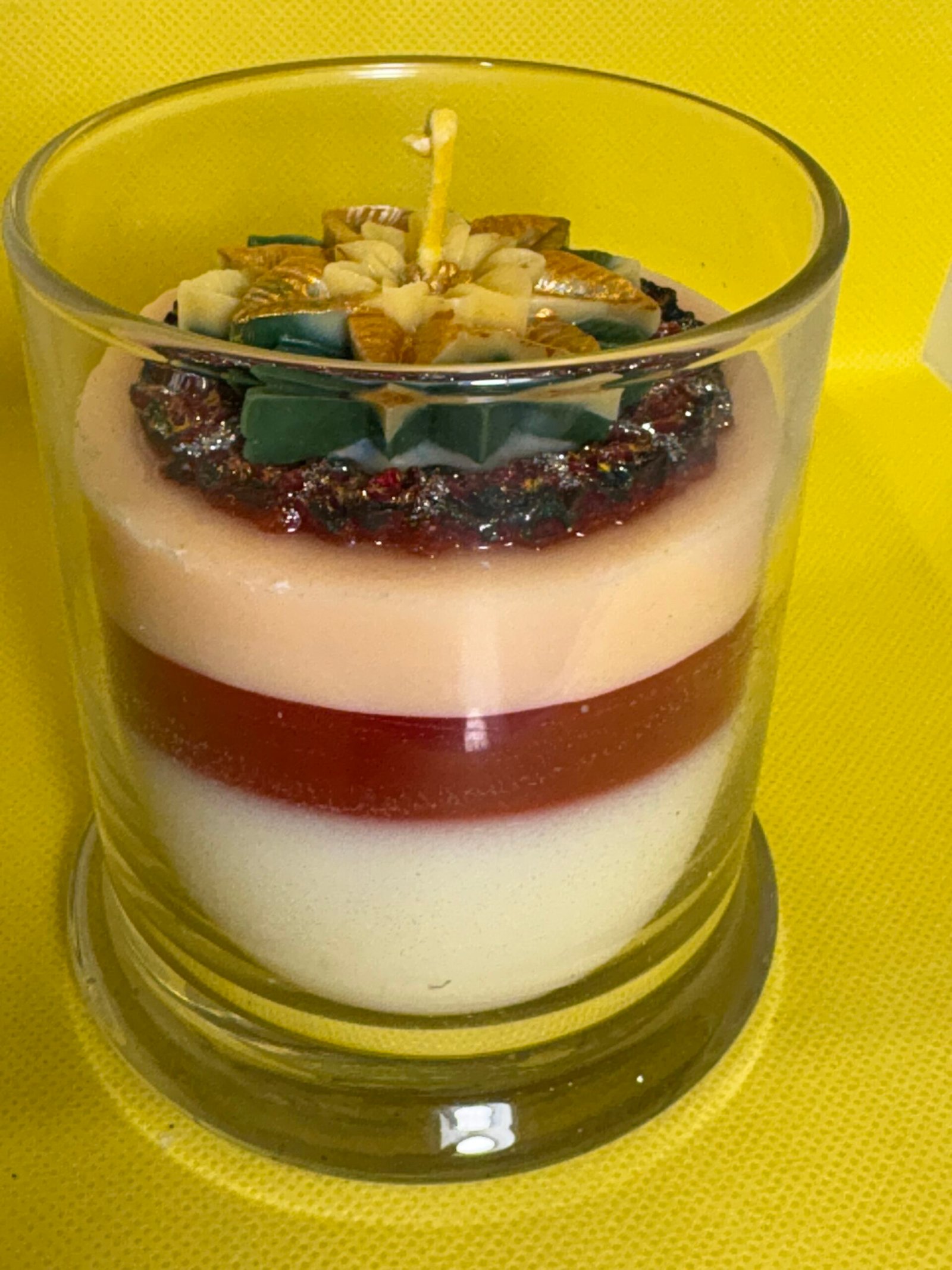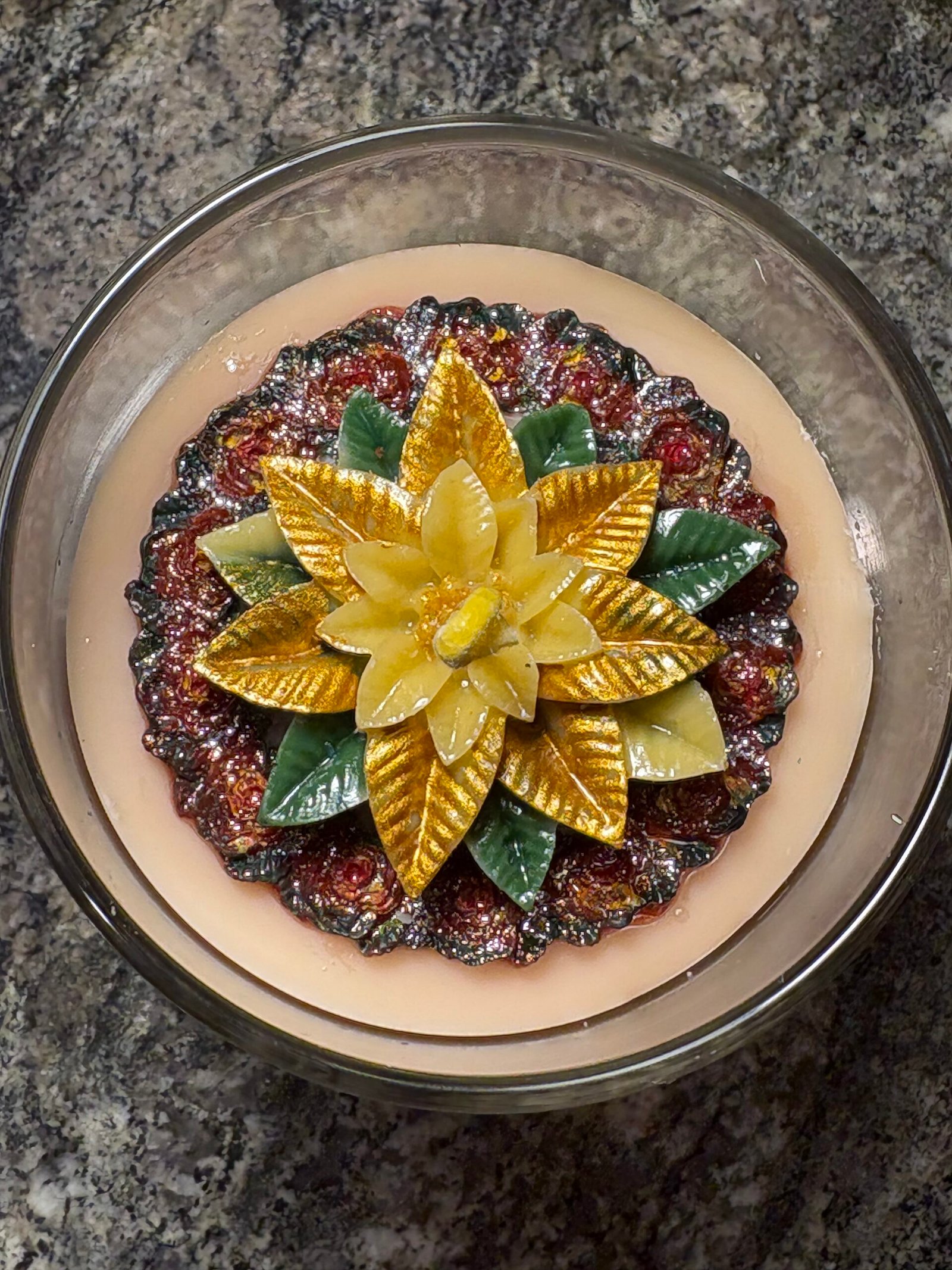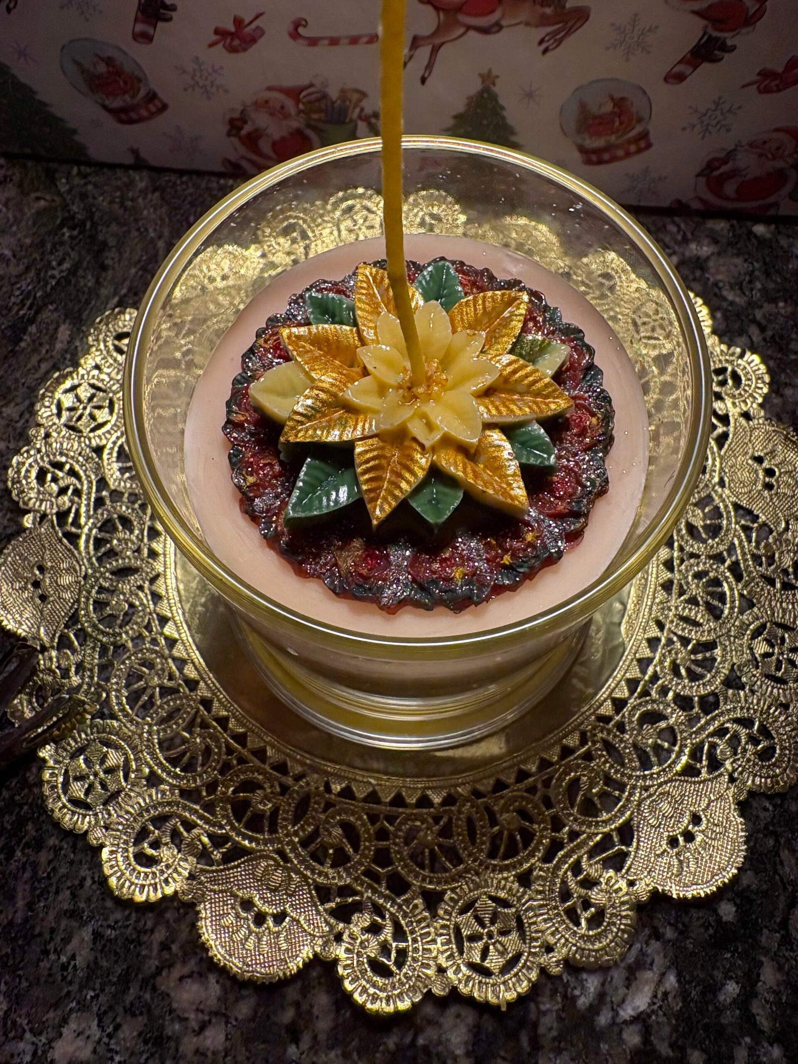 A glass jar trimmed with poinsettias, casting a warm holiday radiance with every flicker.