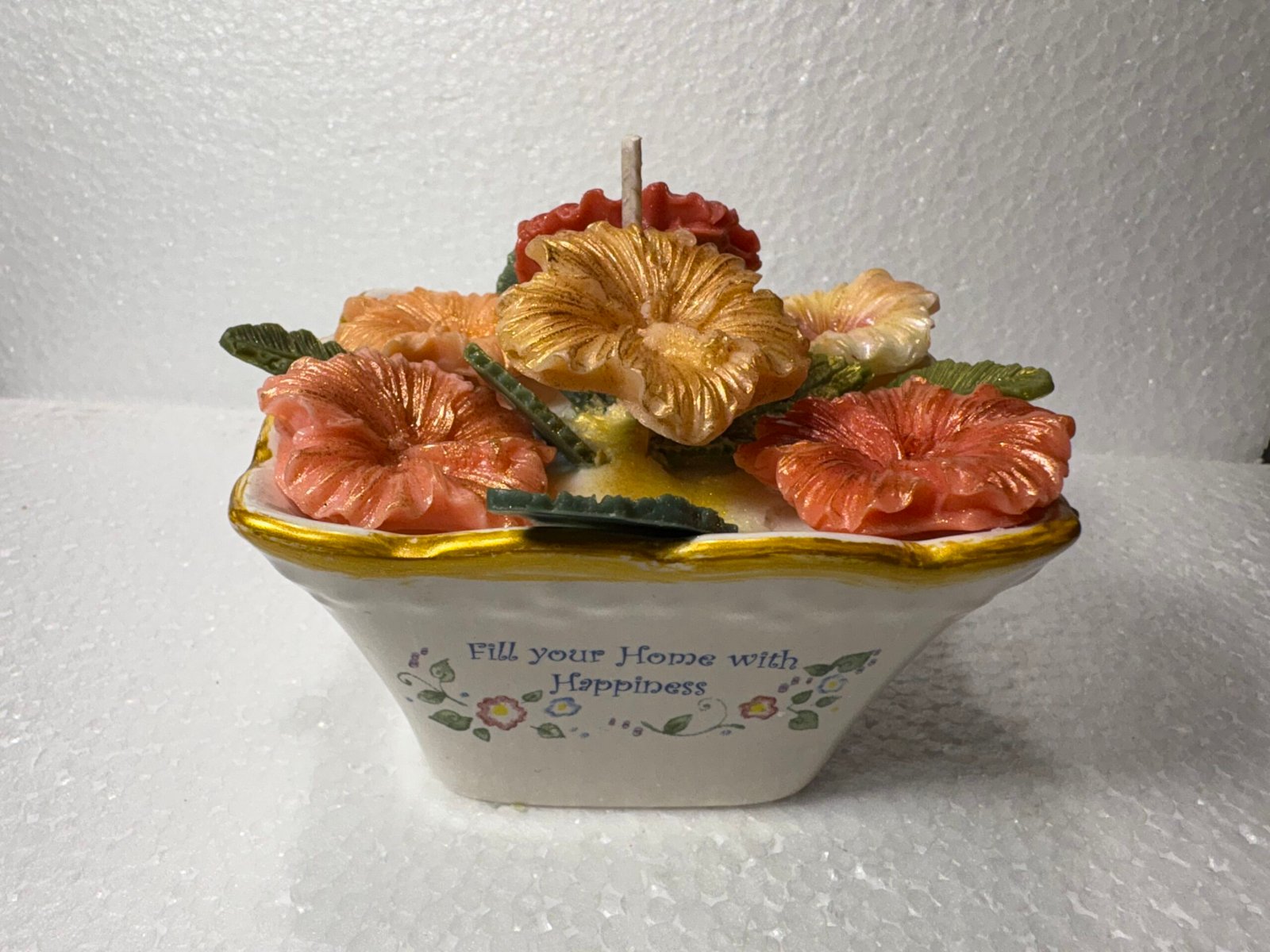Colorful delicate hibiscus flowers individually made, painted and arranged in an elegant ceramic bowl.