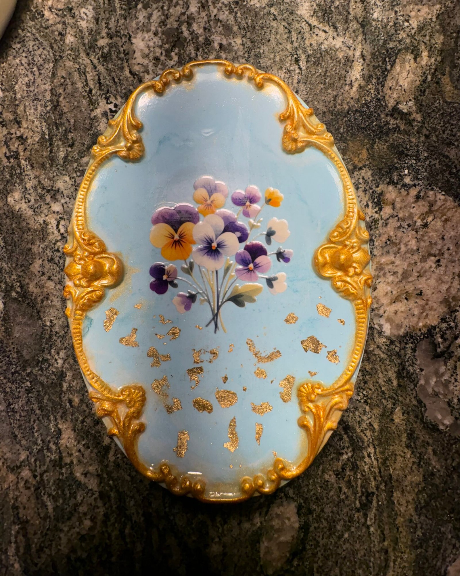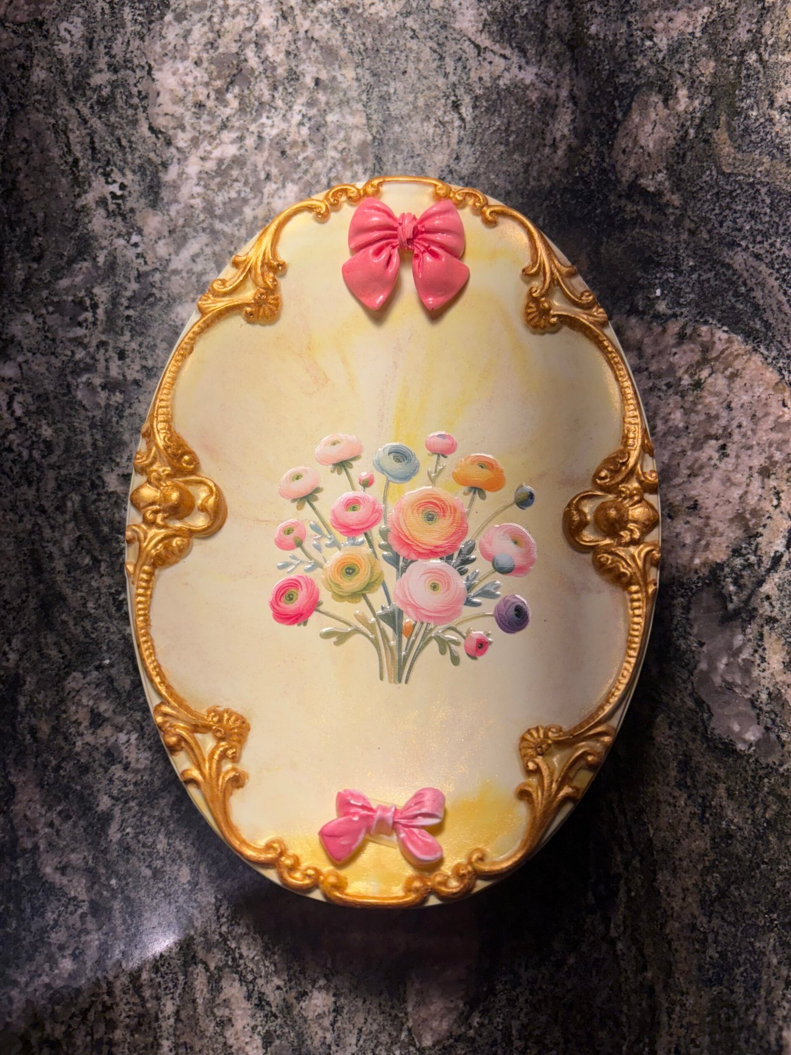 This elegantly hand-made oval tray is made with mineral white powder resin. Delicately hand-painted gold frame and embellished