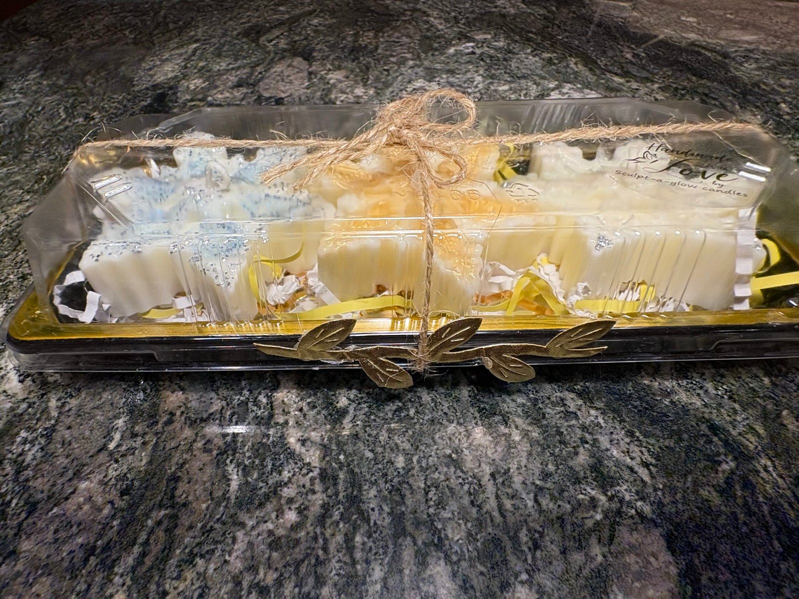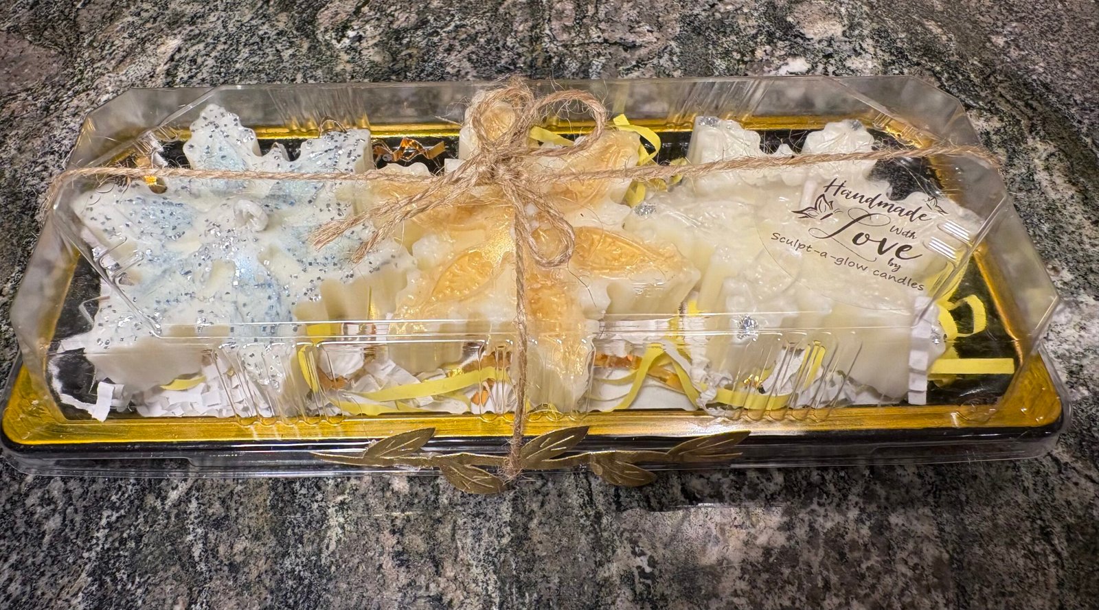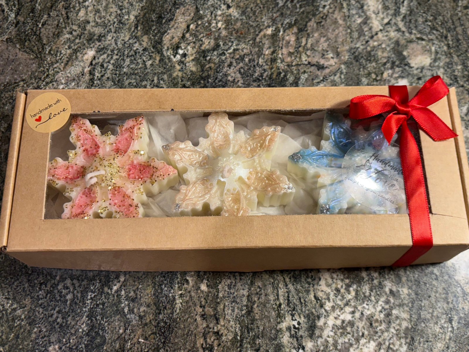 These artfully crafted snowflake candles lights into a graceful winter glow. Perfect for gifting or adding seasonal charm to your home.