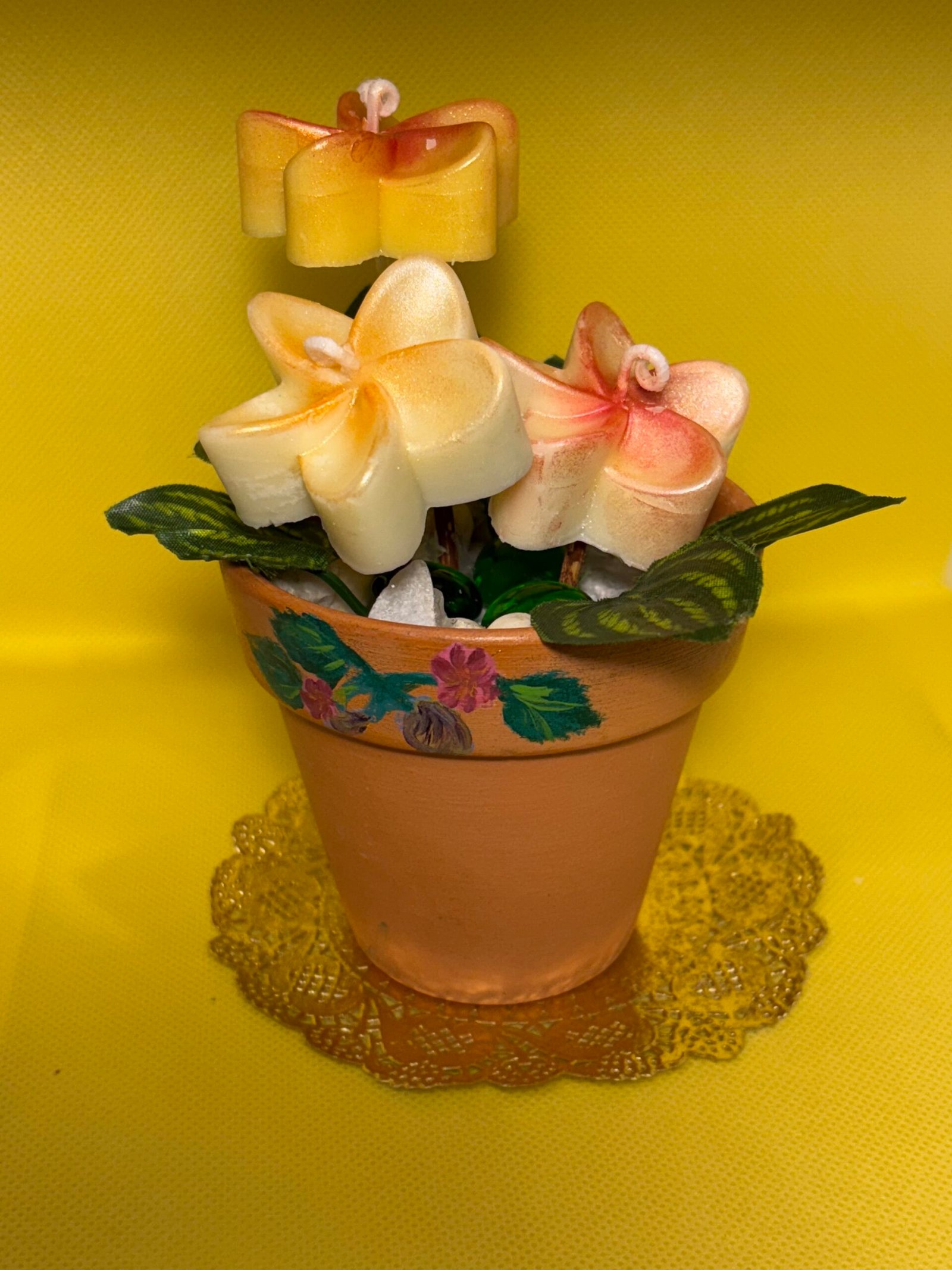 Each plumeria flower Hand-poured, delicately hand-painted and arranged in a hand-painted clay pot.