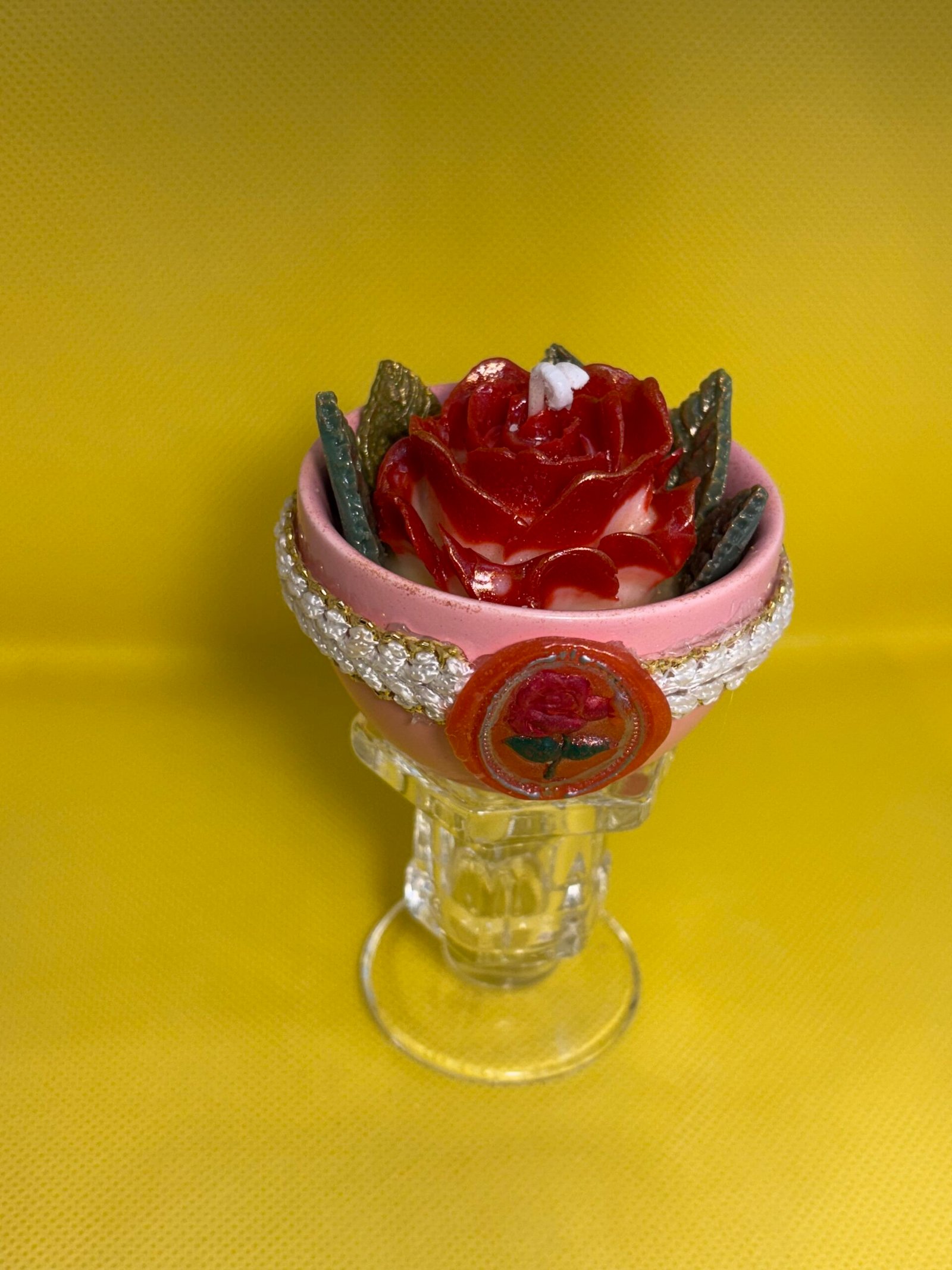 Beautiful single rose candle in a ceramic bowl embellished with a handmade wax seal and elegant lace sitting on a glass candle holder stand.